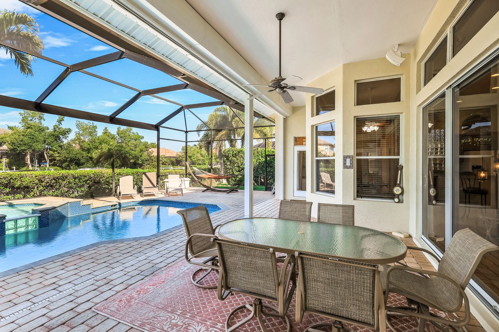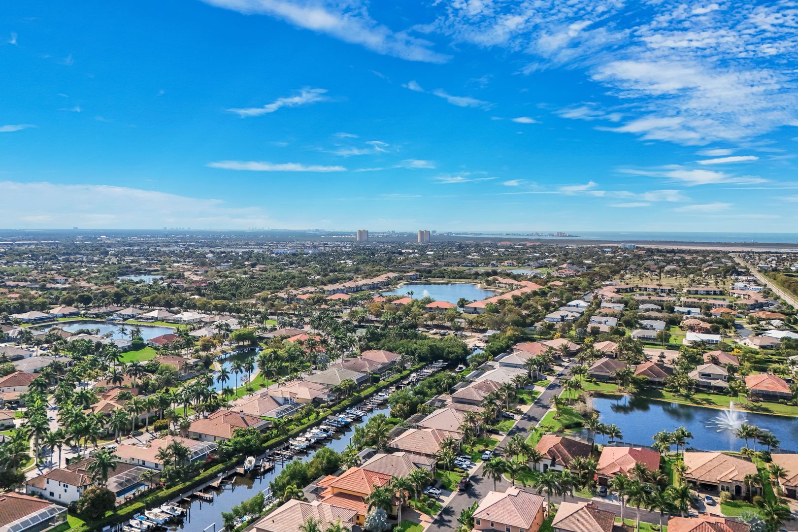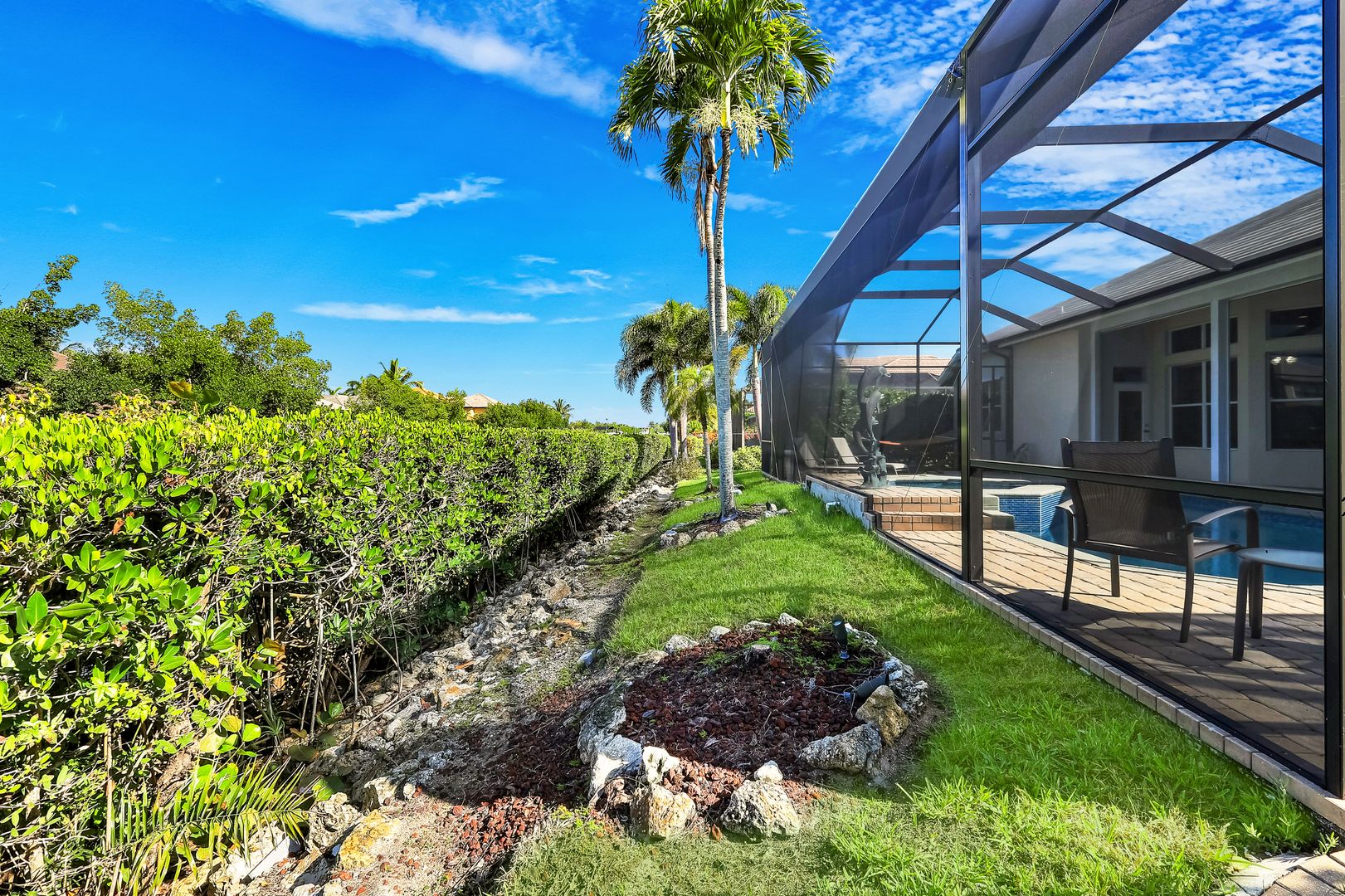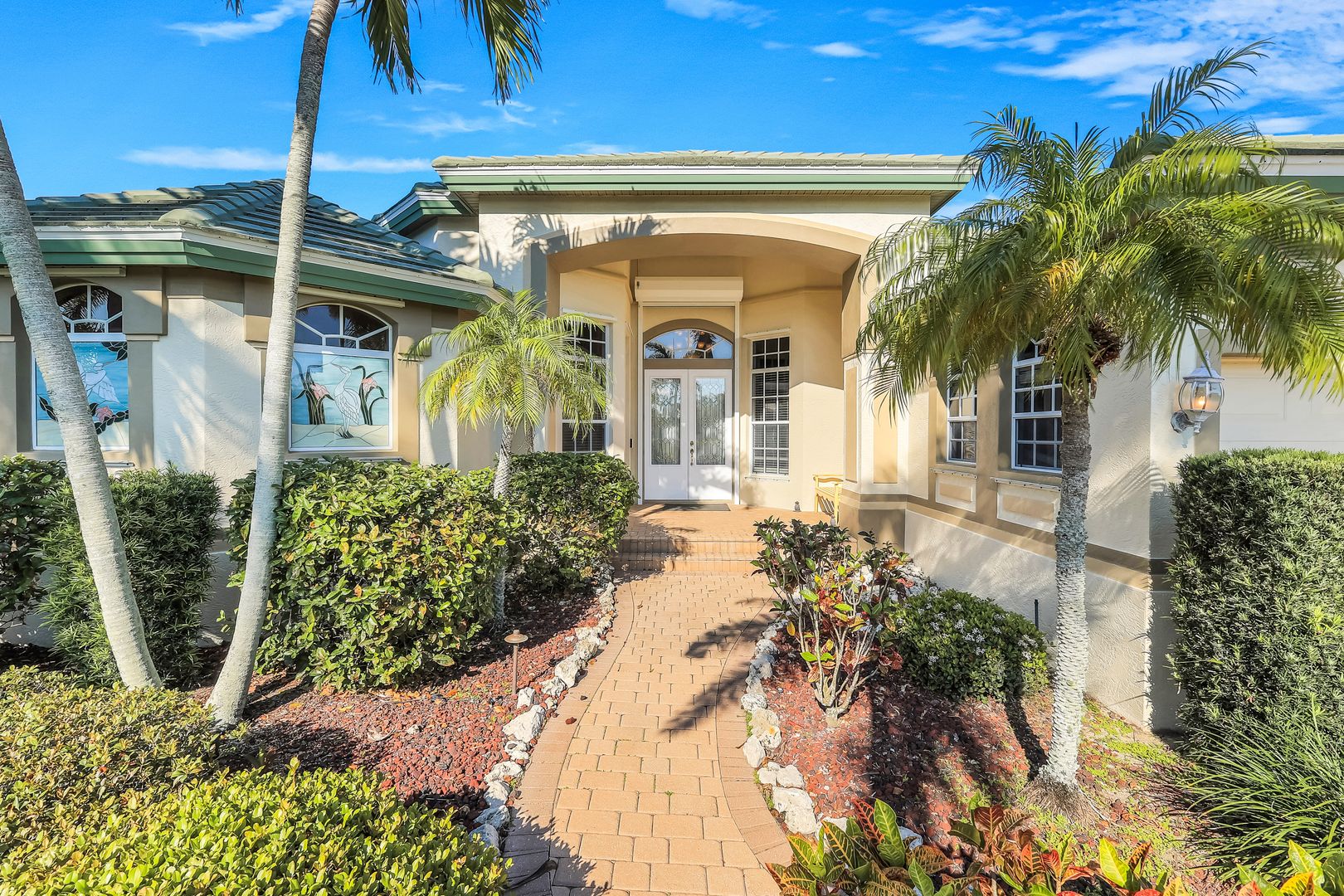 Located in the exclusive gated boating community of Catalpa Cove, this waterfront home WITH NEARLY 2600 SQ. FT. offers rare direct canal access to the river. Ideally situated just 5 minutes to Sanibel Island, 10 minutes to Fort Myers Beach, and approximately 20 minutes to Southwest Florida International Airport. Featuring 3 bedrooms + den and 3 full baths, the home includes double leaded glass entry doors opening to a bright floor plan with immediate views of the private pool and lanai. The kitchen offers solid wood cabinetry, granite counters, ample counter space, pantry, breakfast bar, and breakfast nook overlooking the outdoor living area. The great room features custom built-ins with accent lighting and flows into a spacious dining area. The primary suite includes a triple-tray ceiling with crown molding, dual vanities, a jetted tub, walk-through shower, and decorative stained glass windows. Bamboo flooring in bedrooms; polished travertine throughout main living areas. Outdoor features include a heated pool and spa, brick paver deck, covered seating area, and outdoor kitchen space with privacy hedging. Property includes two assigned docks with lifts. Recent updates: new garage doors on the 3 car, 727 sq. ft. garage, new TILE roof, new A/C, resurfaced pool. Community amenities include a gazebo area with tennis/pickleball courts.