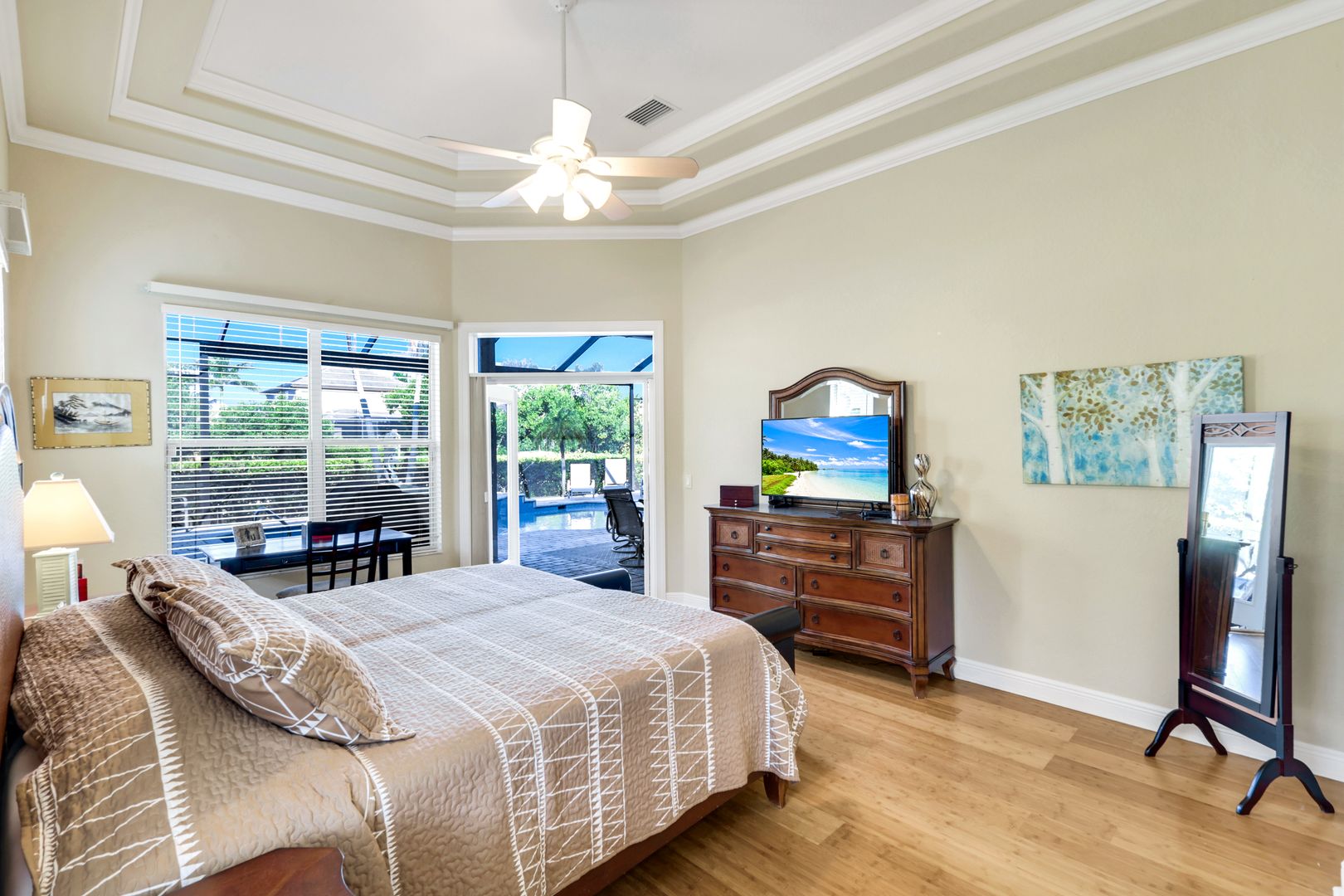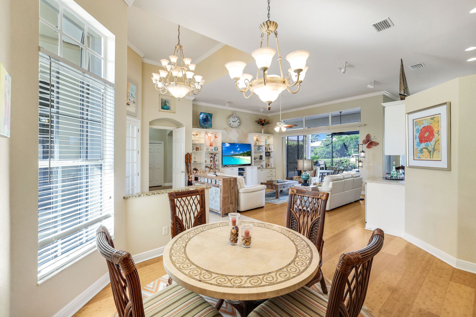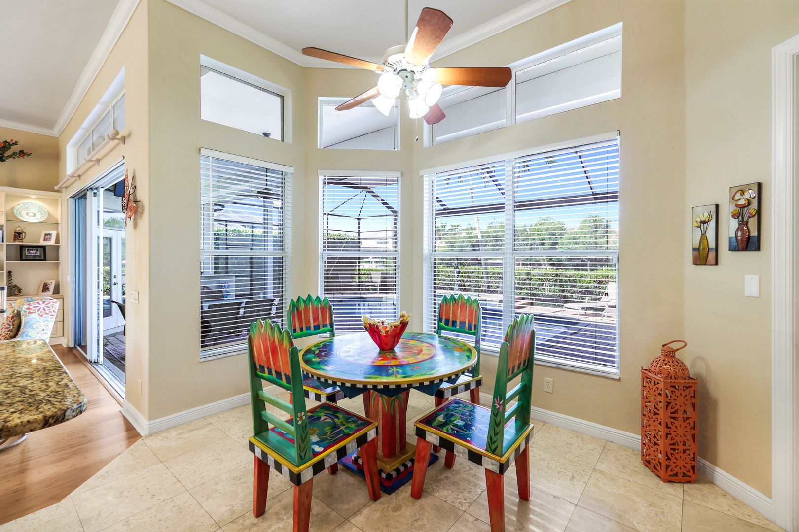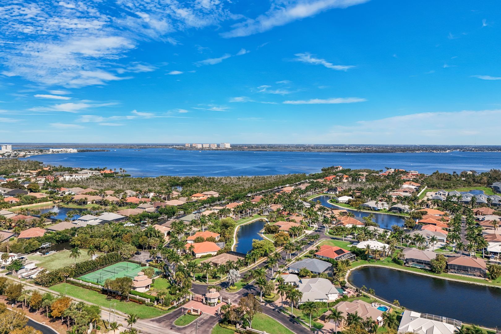 Located in the exclusive gated boating community of Catalpa Cove, this waterfront home WITH NEARLY 2600 SQ. FT. offers rare direct canal access to the river. Ideally situated just 5 minutes to Sanibel Island, 10 minutes to Fort Myers Beach, and approximately 20 minutes to Southwest Florida International Airport. Featuring 3 bedrooms + den and 3 full baths, the home includes double leaded glass entry doors opening to a bright floor plan with immediate views of the private pool and lanai. The kitchen offers solid wood cabinetry, granite counters, ample counter space, pantry, breakfast bar, and breakfast nook overlooking the outdoor living area. The great room features custom built-ins with accent lighting and flows into a spacious dining area. The primary suite includes a triple-tray ceiling with crown molding, dual vanities, a jetted tub, walk-through shower, and decorative stained glass windows. Bamboo flooring in bedrooms; polished travertine throughout main living areas. Outdoor features include a heated pool and spa, brick paver deck, covered seating area, and outdoor kitchen space with privacy hedging. Property includes two assigned docks with lifts. Recent updates: new garage doors on the 3 car, 727 sq. ft. garage, new TILE roof, new A/C, resurfaced pool. Community amenities include a gazebo area with tennis/pickleball courts.